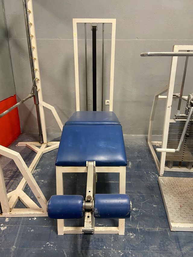 Máquina de gimnasio para trabajar los femorales. Ideal para complementar tu rutina de ejercicios. - Tapicería azul. - Estructura metálica.