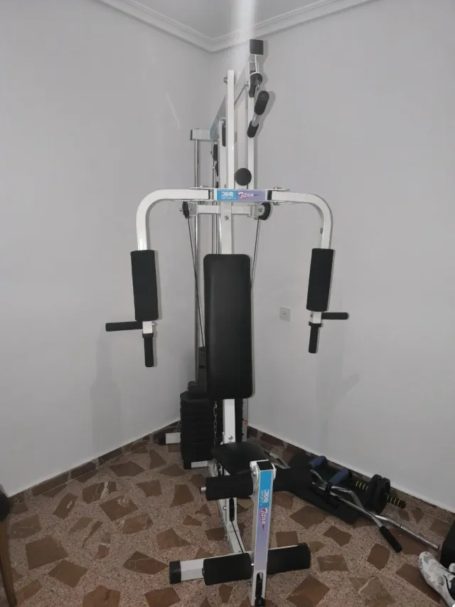 Máquina de gimnasio multifunción para entrenar en casa. - Estructura robusta de acero. - Incluye pesas. - Asiento acolchado.