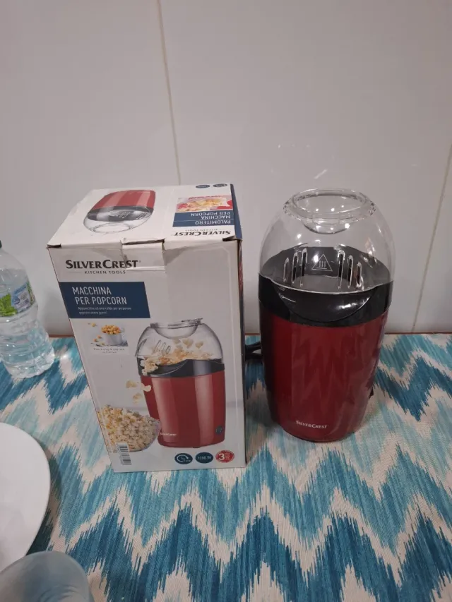 Máquina para hacer palomitas de maíz de la marca SilverCrest. Diseño moderno en color rojo. - Potencia de 1200W. - Incluye tapa transparente.