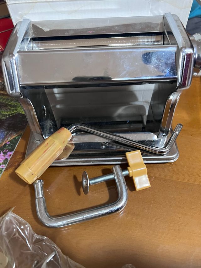 Detalles del productoMáquina laminadora de metal cromado para hacer pasta en casa. Incluye manivela y abrazadera para fijarla a la mesa.