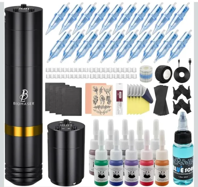 Detalles del productoEste Kit para tatuajes es ideal para aprender, practicar y realizar tatuajes, ya que trae todos los accesorios básicos necesarios para empezar. 🎨🖊️
