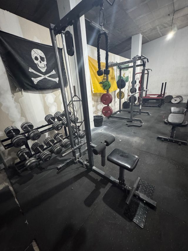 Equipo de gimnasio para ejercicios de jalón al pecho y remo. - Estructura metálica. - Polea con cable. - Accesorio de cuerda para polea.