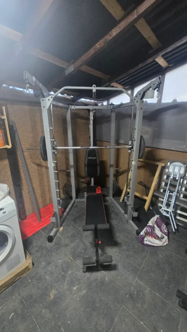 Vendo maquina Smith con poleas, banqueta y discos de peso (4 de 10Kg y 2 de 20Kg) en perfecto estado. Peso max 140Kg. Posibilidad de transporte y montaje incluido.