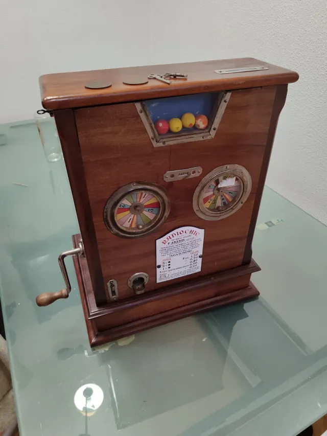 Detalles del productoAntigua máquina tragaperras de madera. Un objeto decorativo con un diseño clásico.
