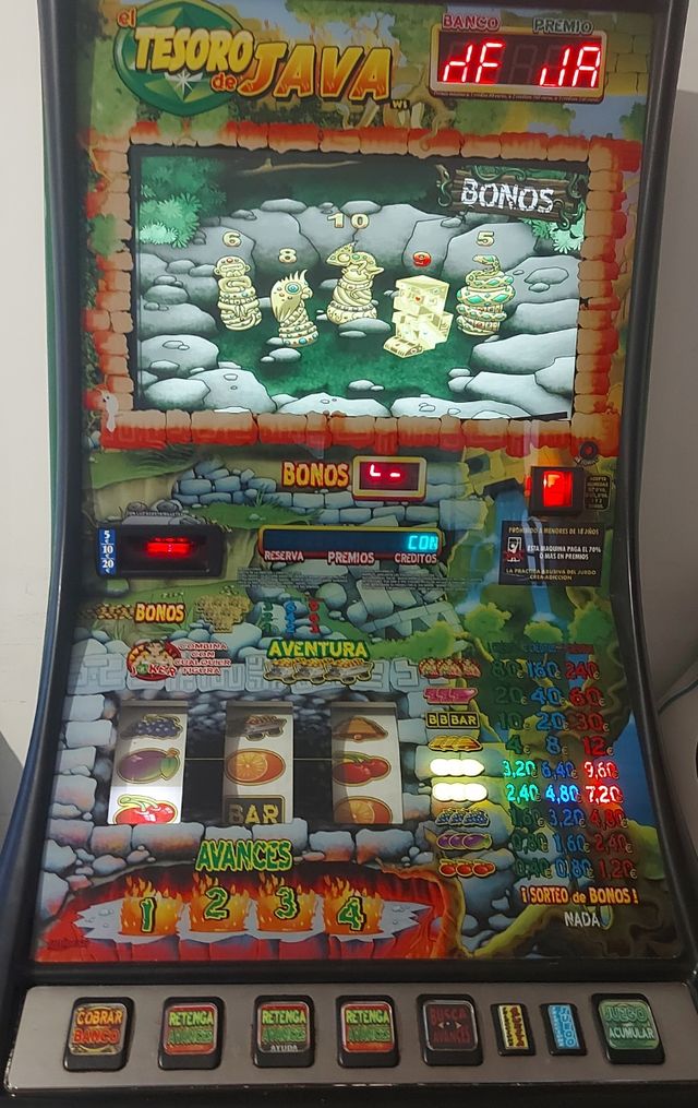 Detalles del productoMáquina tragaperras Tesoro de Java en buen estado.