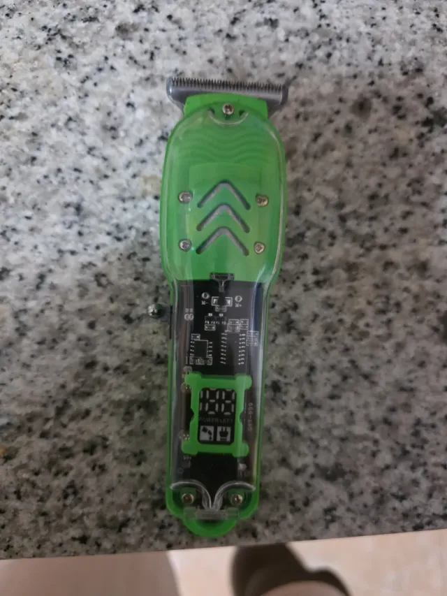Detalles del productoMáquina trimmer profesional con un diseño moderno y transparente en color verde. Ideal para cortes precisos y estilizados.