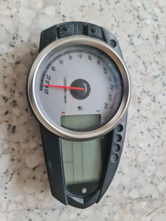 Marcador para motocicleta Kawasaki. - Tacómetro con escala de 0 a 14 x1000 r/min. - Indicador de combustible. - Pantalla digital inferior.