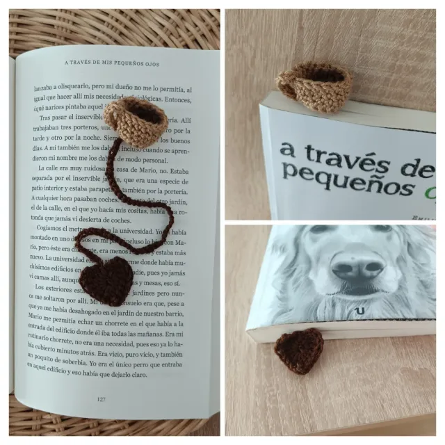 Marcapáginas hecho a mano con forma de taza de café y corazón. - Diseño tejido a crochet. - Color café y marrón.