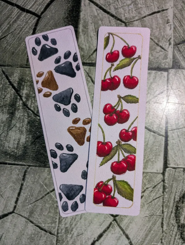 - El otro marcapáginas está decorado con un vibrante diseño de cerezas rojas.