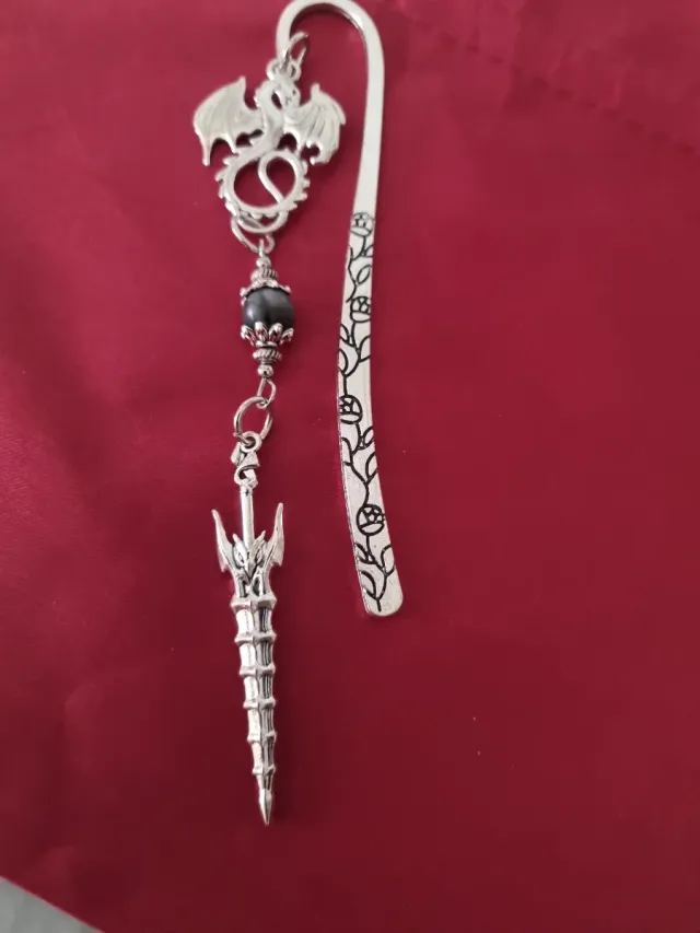 Este marcapáginas tiene un diseño único con un dragón y una espada. - Color plateado. - Colgante de dragón. - Colgante de espada. - Cuenta con una cuenta oscura.