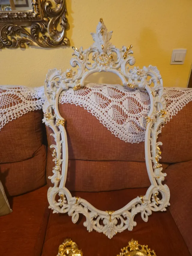 Elegante marco de estilo barroco, con un acabado en blanco y detalles dorados. - Diseño ornamentado. - Acabado en blanco mate. - Detalles decorativos en dorado.