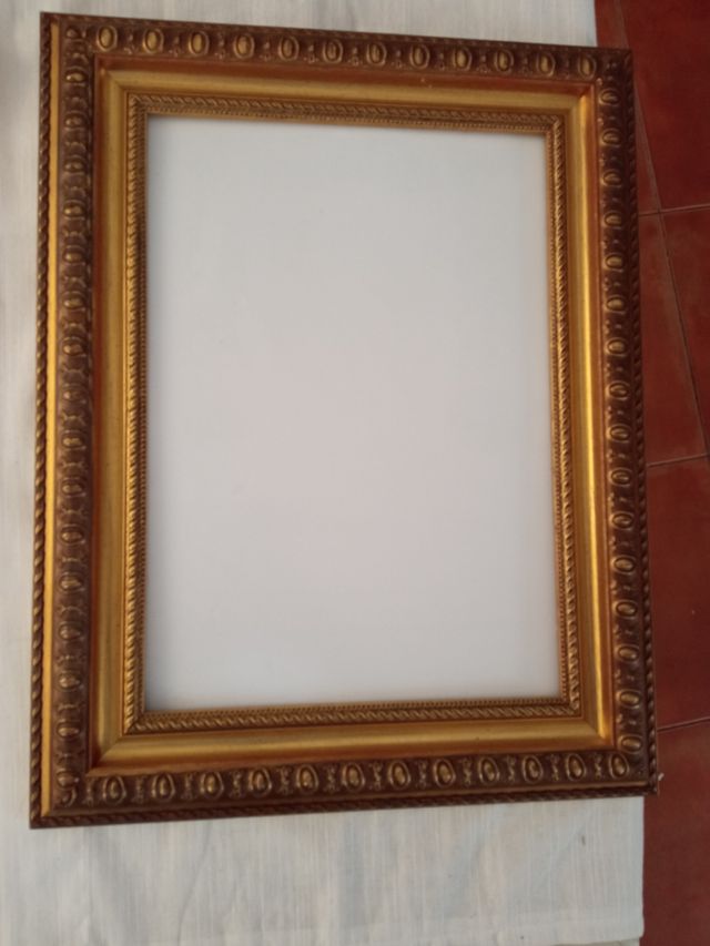 Marco con molduras doradas y cristal. Medidas en fotografias . Exterior 53 x 41 cm Interior 38,5x 27,1 cm.