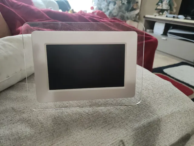 Marco de fotos digital con un diseño moderno y elegante. Perfecto para exhibir tus recuerdos. - Marco de color blanco. - Soporte transparente.