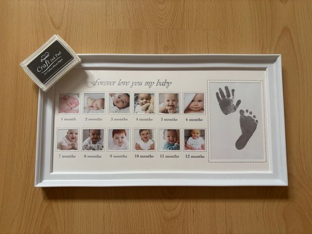 Detalles del productoMarco de fotos blanco para bebé con espacio para 12 fotos mensuales y huellas.