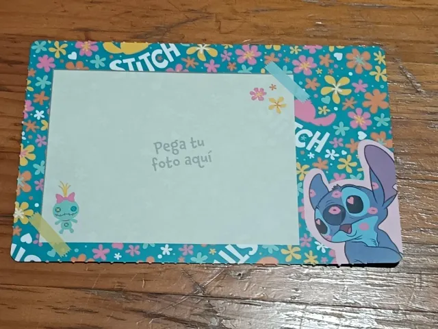 Detalles del productoMarco de fotos decorado con el personaje Stitch y un alegre estampado floral. Incluye un espacio para pegar tu foto.