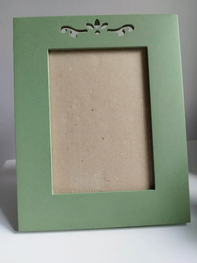 Detalles del productoMarco de fotos de color verde con un diseño decorativo en la parte superior. Se puede colgar o apoyar.
