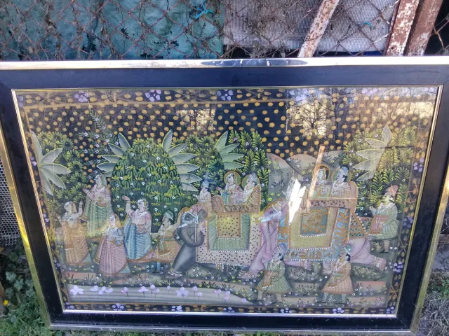 Detalles del productoMarco con una pintura oriental detallada. La obra presenta una escena con figuras y un elefante, rodeada de vegetación y un fondo estrellado.