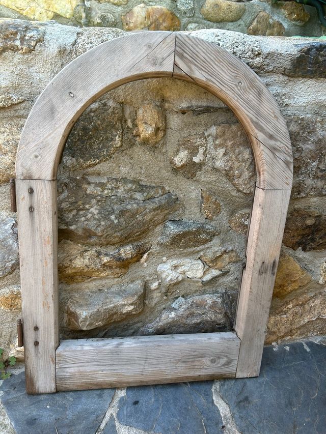 Detalles del productoMarco de ventana antiguo con un diseño arqueado y detalles rústicos.