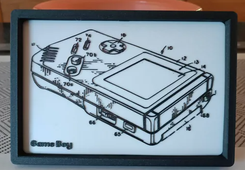Detalles del productoPreciosa pieza decorativa con el diseño de la patente del Game Boy. Es un marco elegante y único. Viene incluido en el precio. Diseño impreso en 3D