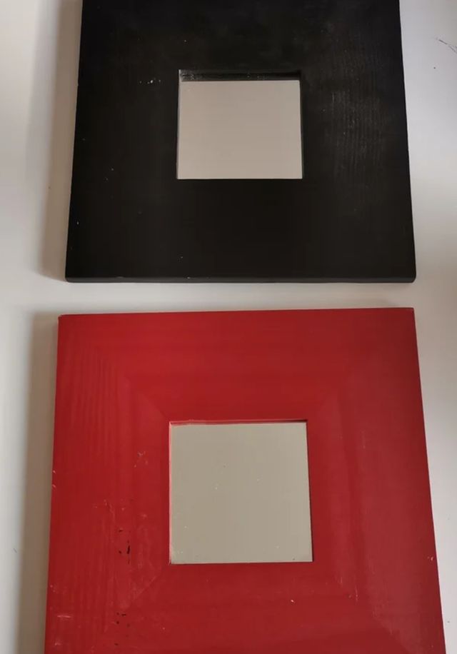 Detalles del productoConjunto de dos marcos con espejo. De madera y forma cuadrada. Miden 26 cm. Son de Ikea. Color negro y granate. El granate tiene unas pequeñas marcas negras como se aprecia en la foto.