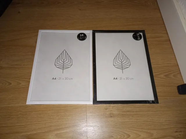 Detalles del productoSe venden marcos de fotos en formato A4, perfectos para tus recuerdos. A estrenar, aún precintados. Precio por unidad, tengo 15 blancos y 11 negros. Hago descuento según cantidad.