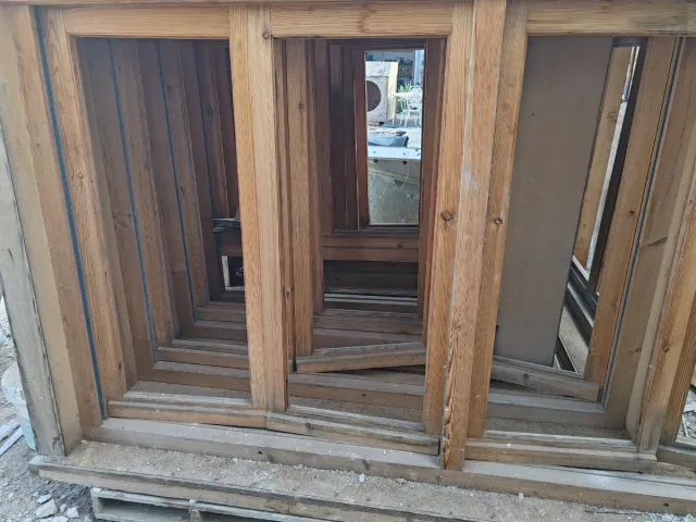 Conjunto de marcos de ventana de madera. - Material: Madera natural. - Diseño: Marcos de ventana. - Cantidad: Varios marcos apilados.