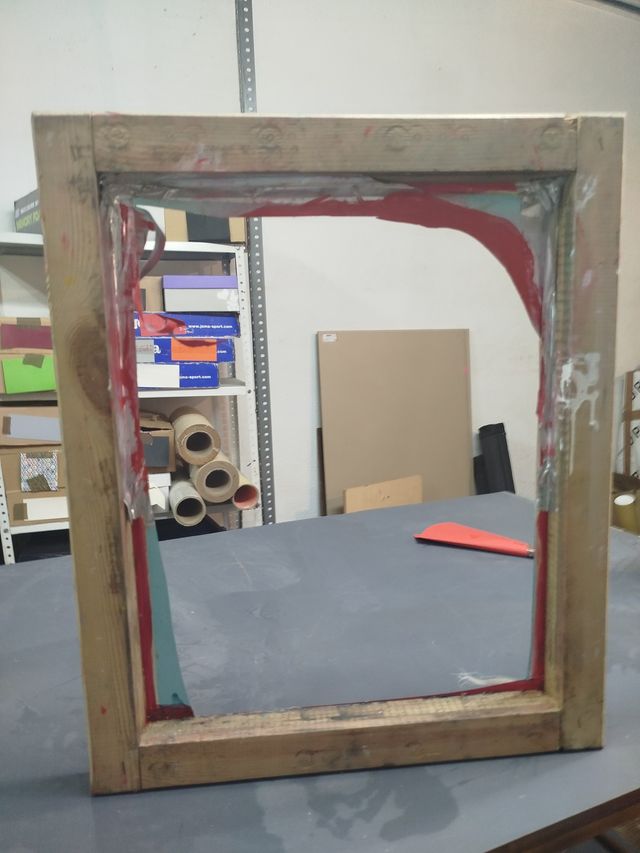 Marcos de madera para serigrafía. Listos para usar. - Estructura de madera. - Bordes con restos de pintura y cinta de protección. 3 unidades