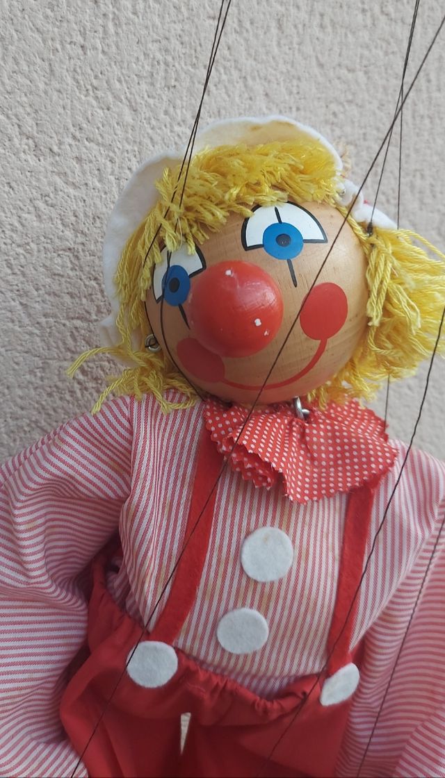 Marioneta de payaso, de madera, es todo de madera articulado, vintage de los 80, la figura del payaso mide 50cm. y sus cuerdas otros 50cm.