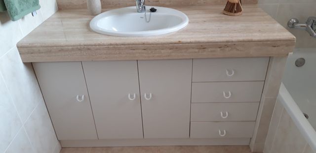 Mármol travertino de baño de 134 cm de largo x 58 cm de ancho con zocalo y faldón (no se incluyen muebles ni pica, es el marmol).