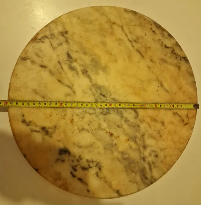 Pieza redonda de mármol con vetas oscuras. - Material: Mármol natural. - Forma: Redonda.