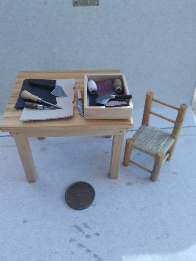 Mini mesa , silla , herramientas de talabartero y trozos de cuero , escala 1:12 aproximadamente , más en mi perfil