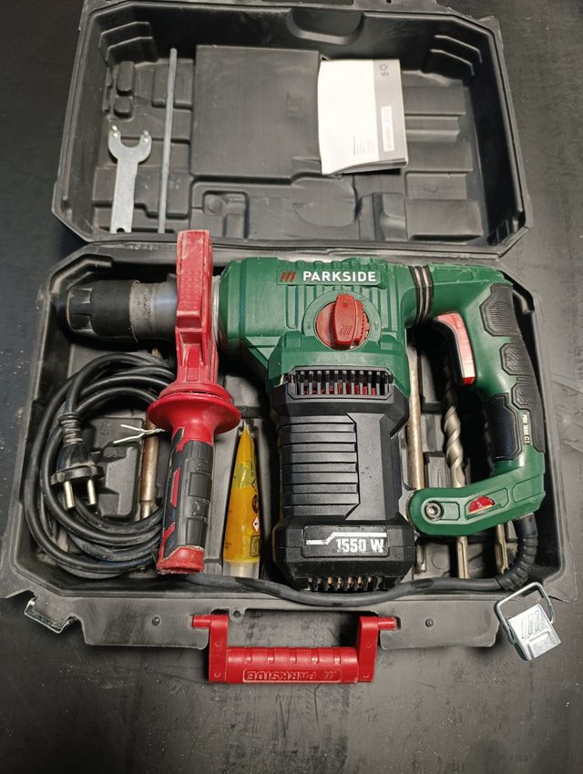 Martillo cincelador Parkside de 1550W con una fuerza de 5 julios - Incluye cinceles y brocas. - Empuñadura auxiliar. - Grasa lubricante.
