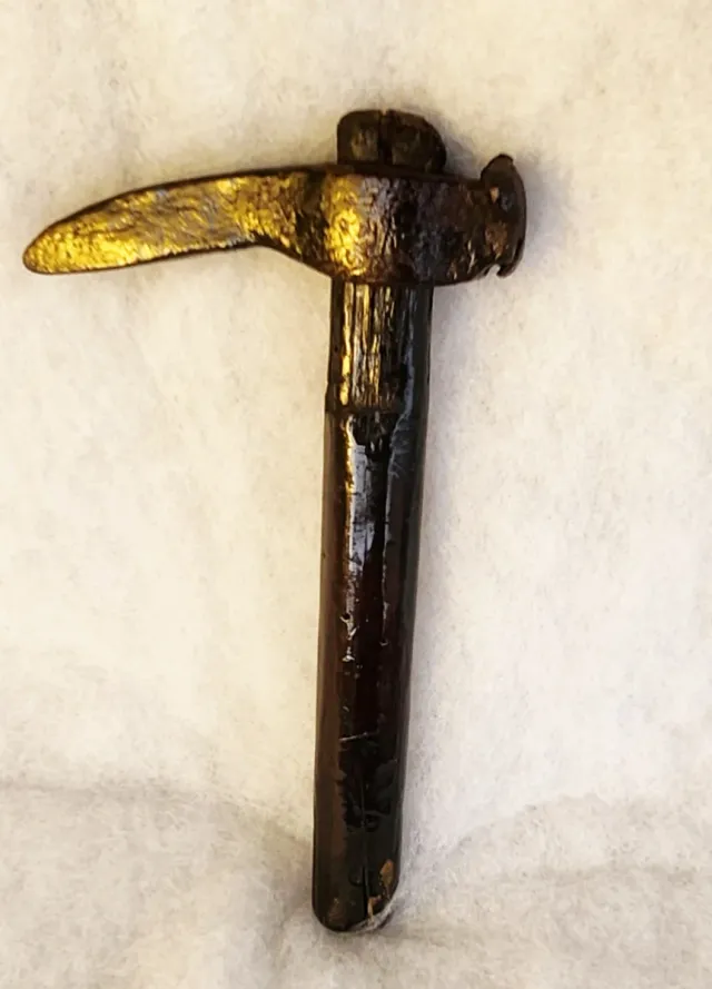 Detalles del productoHerramienta de mano antigua con mango de madera oscura y cabeza de metal.