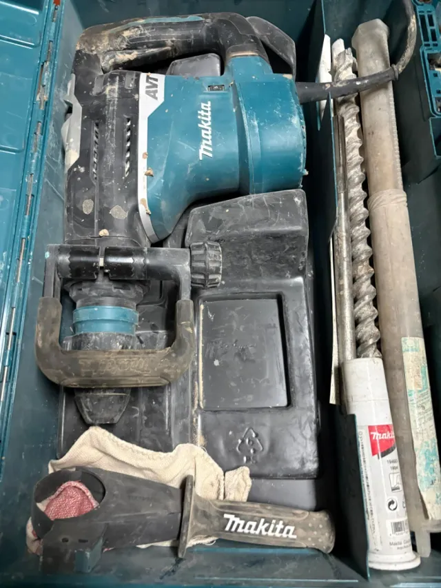 Martillo demoledor Makita AVT en su maletín. - Incluye cincel. - Empuñadura auxiliar. - Maletín de transporte. -posibilidad de añadir más brocas y accesorios