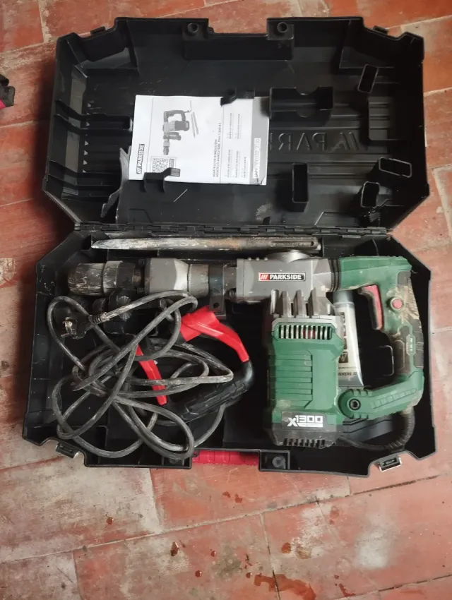 Martillo eléctrico Parkside X1300 en su maletín. - Incluye manual de instrucciones. - Cable de alimentación. - Maletín de transporte.