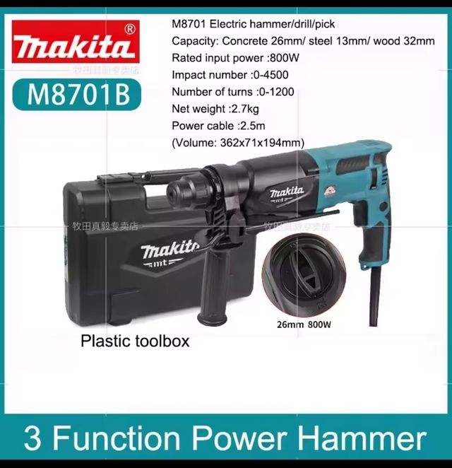 Detalles del productoMartillo ligero Makita M8701B, ideal para trabajos de construcción y bricolaje. Incluye maletín de plástico.