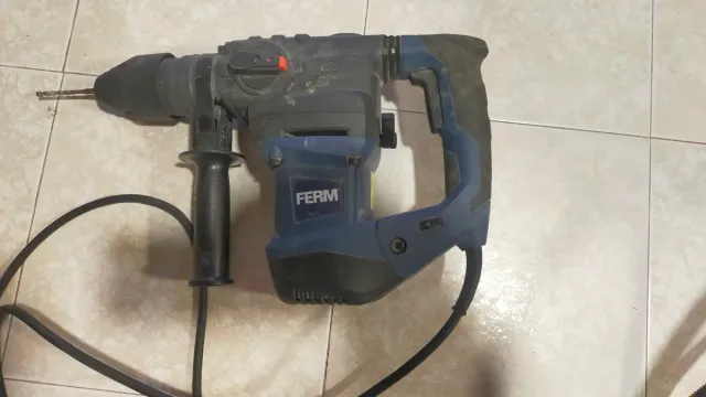 Martillo perforador de la marca Ferm. Herramienta robusta y funcional. - Mango auxiliar para mayor control. - Incluye cable de alimentación.