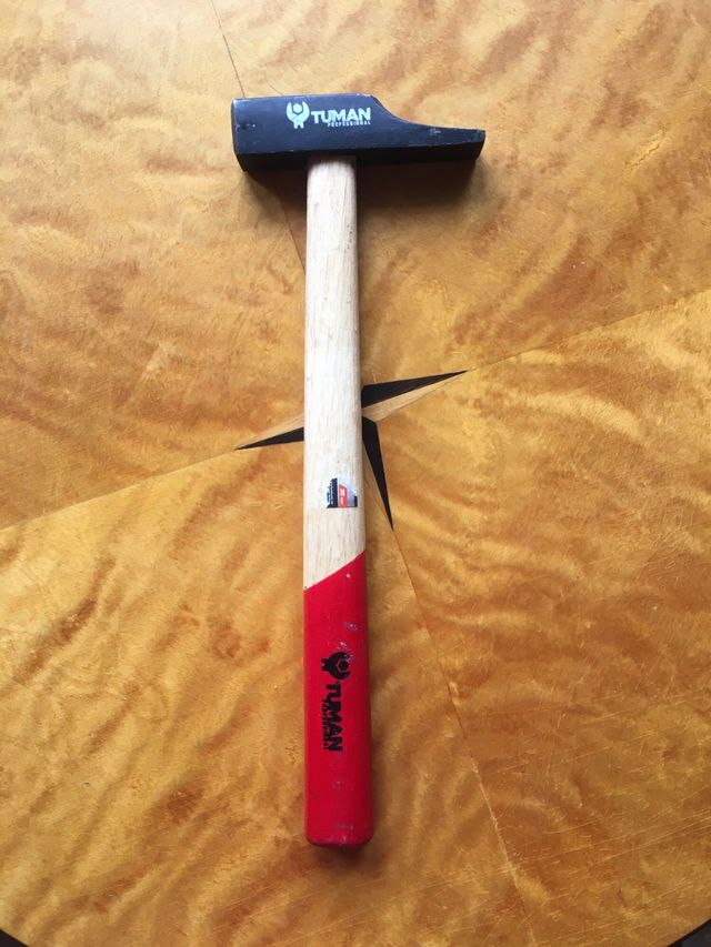 Martillo de la marca TUMAN con mango de madera y empuñadura roja. - Mango de madera. - Empuñadura de color rojo. - Logo de la marca TUMAN visible.