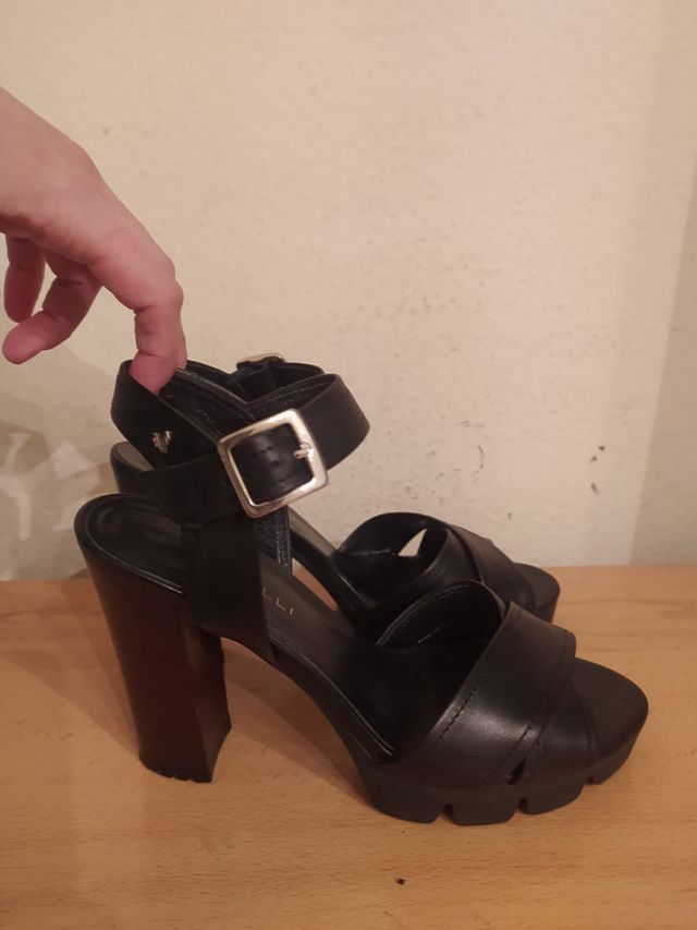 Sandalias de tacón ancho - num.38 (medidas en la foto de las suelas) - piel color negro - hebilla lateral - Poco usadas, en muy buen estado