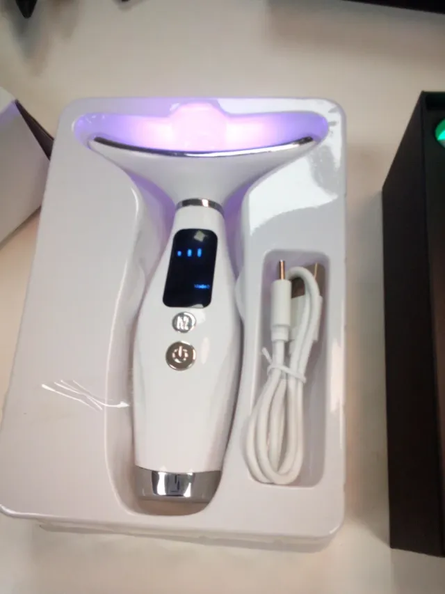 Dispositivo para el cuidado del cuello con luz LED. - Diseño ergonómico en color blanco. - Incluye cable de carga USB.