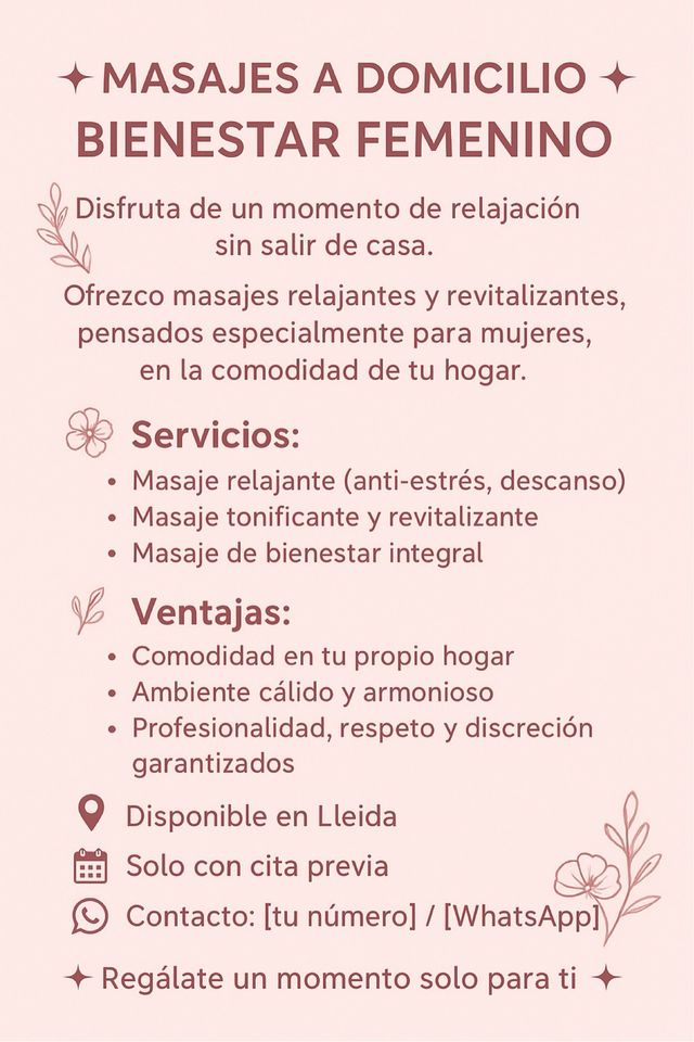 Disfruta de un momento de relajación sin salir de casa. Ofrezco masajes relajantes y revitalizantes, pensados especialmente para mujeres, en la comodidad de tu hogar.
