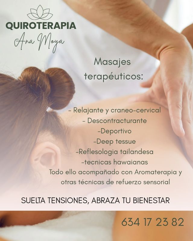 Detalles del productoOfrezco mis servicios como quiromasajista terapéutica, con más de 10 años de experiencia en el mundo del autocuidado.