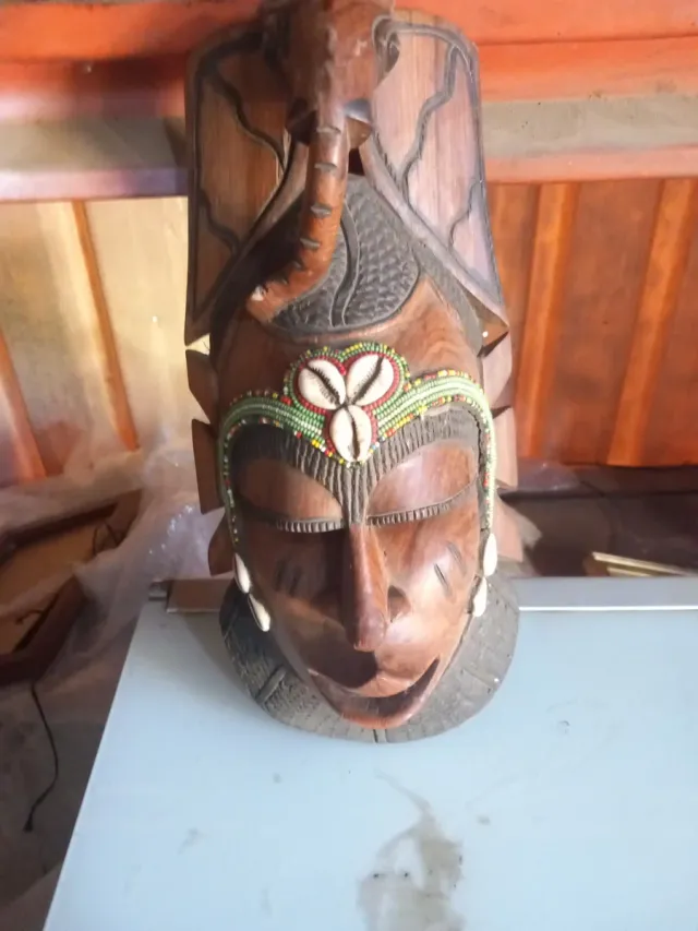 Detalles del productoMáscara decorativa de estilo africano, tallada en madera. Presenta un diseño detallado con un elefante en la parte superior y adornos.