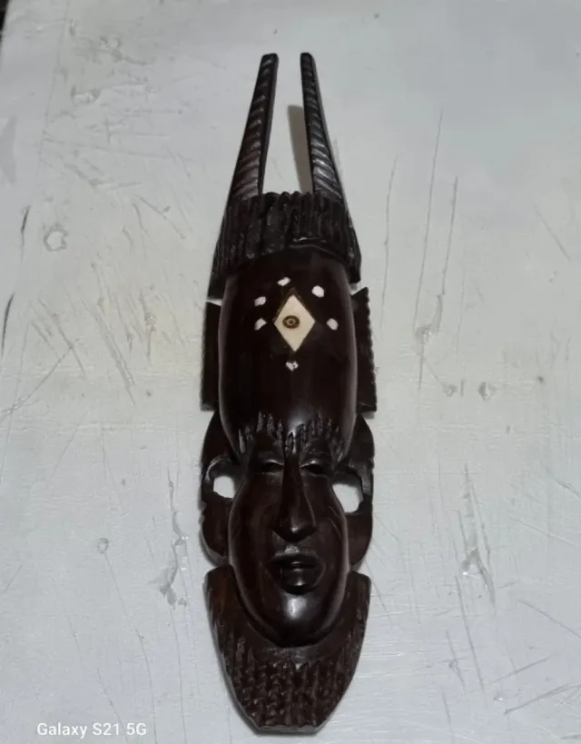 Máscara decorativa de estilo africano, elaborada en madera oscura con detalles incrustados en hueso.