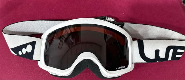 Máscara de esquí en buen estado, lista para tu próxima aventura en la nieve. - Montura blanca. - Correa con diseño. - Lente con tinte oscuro.