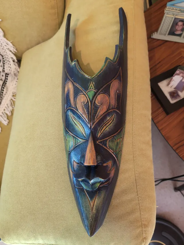 Detalles del productoMáscara decorativa de madera con un diseño tribal y colores vibrantes. Perfecta para añadir un toque exótico a tu hogar.