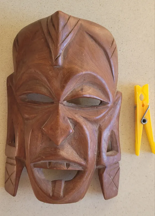 Máscara decorativa de madera, tallada a mano con un diseño étnico. - Material: Madera. - Estilo: Decoración étnica. - Técnica: Tallado a mano.