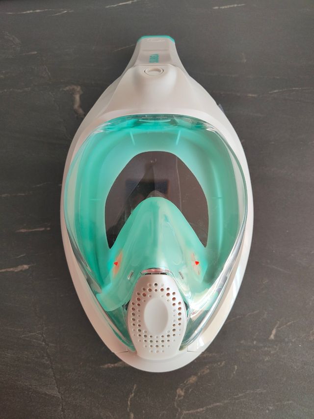 Detalles del productoMáscara de snorkel Easybreath 900 (de Decathlon) en color blanco y turquesa.