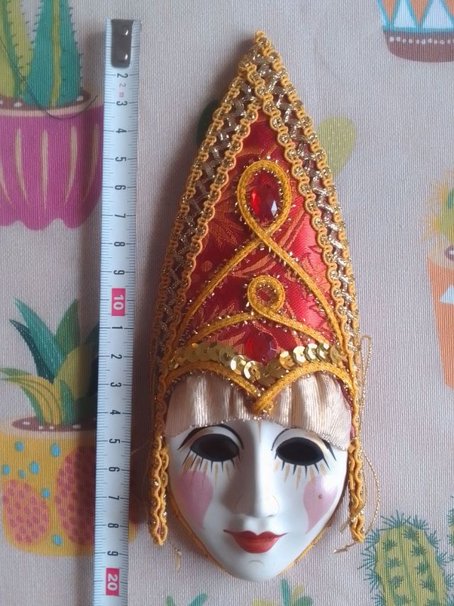 Detalles del productoMáscara veneciana decorativa, ideal para colgar en la pared. Presenta un diseño colorido y festivo.