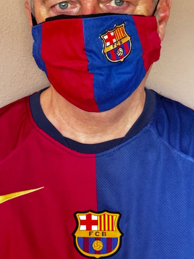 Mascarilla con el escudo del F.C. Barcelona. - Diseño dividido en rojo y azul. - Escudo oficial del club.